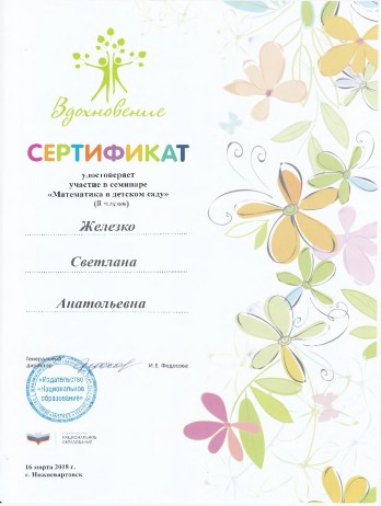Сертификата участия в семинаре «Математика в детском саду»