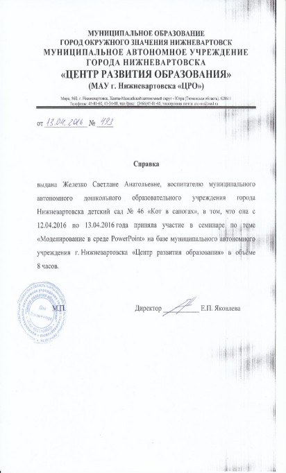 Справка об участии в семинаре по теме: «Моделирование в среде PowerPoint